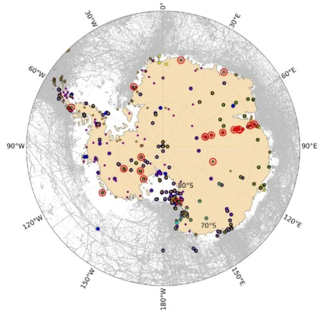 The figure below illustrates the geographical distribution of available observational data in Antarctica from 1979 to 2023. The data comes from a number of manned and automatic weather stations, together with meteorological observations over the ocean collected from ships and buoys. As can be seen, the majority of observations are in coastal or near-coastal regions, precluding full spatial coverage of the continent.
