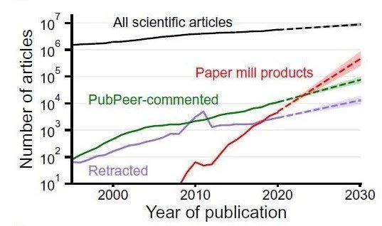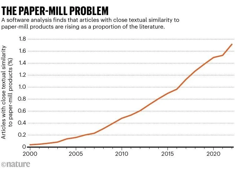 A 2023 report in Nature magazine identified more than 400,000 research articles published over the previous two decades that show strong textual similarities to known studies produced by paper mills; the rising trend is illustrated in the figure below.