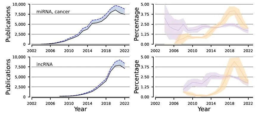 Apart from these examples of potentially fraudulent behavior, the study authors investigated whether certain scientific disciplines were more prone to fraud than others. It was found that the phenomenon is much more pronounced in six subfields in the area of RNA biology. As shown in the next figure, papers involving “lncRNAs” and “miRNAs, cancer” feature retraction rates that peak at around 4%, higher than even the rates of papers withdrawn due to errors.