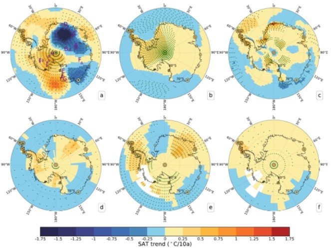 You can see that none of the standard datasets exhibit the pronounced cooling trend in East Antarctica in (a), something that was inferred earlier from the ERA reanalysis dataset by a different group of Chinese researchers. Nevertheless, all datasets show warming in the Antarctic Peninsula (on the left of the continent in the maps above).