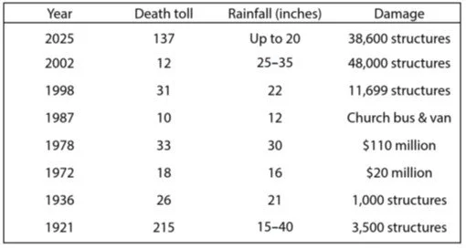 Second, heavier rainfall does not necessarily lead to an increase in extreme flooding probability, which depends on other factors such as rainfall duration, landscape and the type of river basin. In fact, disastrous floods in Texas’ Flash Flood Alley are nothing new and have caused devastation for more than a century, as shown in the following table.