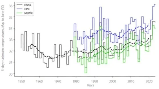 Apart from the general limitations of attribution studies, the absurdity of such a claim can be seen in the conclusions drawn from the temperature datasets employed. The figure below shows the May to June maximum of 5-day maximum daytime temperatures in the study region from 1950 to 2024, for all three datasets; the dashed lines are 10-year moving averages.