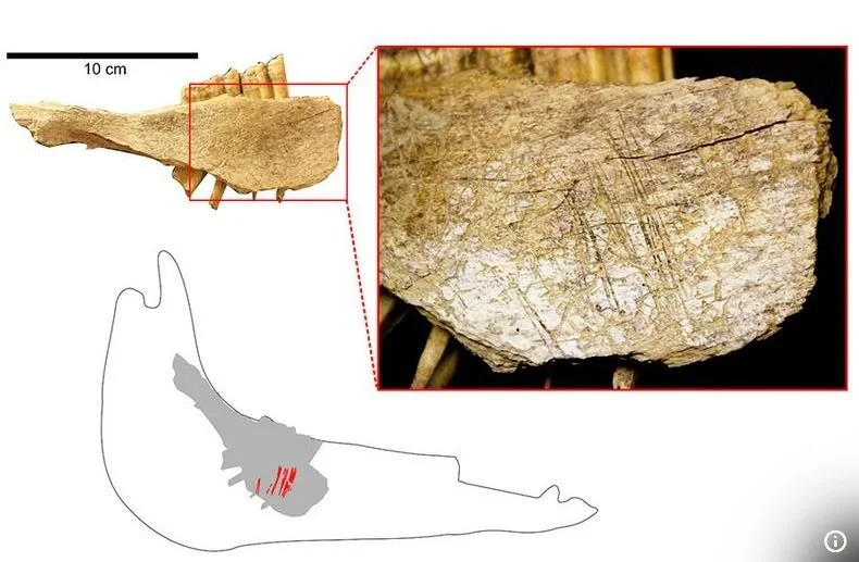 Cinq-Mars and his team made an important discovery – bones of horses and woolly mammoths that exhibited cut marks from human butchering and toolmaking. Depicted on the left is a fragment from a horse’s jawbone showing deep thin cuts with a V-shaped profile, typical of butchery to remove muscle. Even more remarkably, radiocarbon testing dated the oldest finds to around 24,000 years ago, thousands of years before the Clovis people were thought to have been in the vicinity.