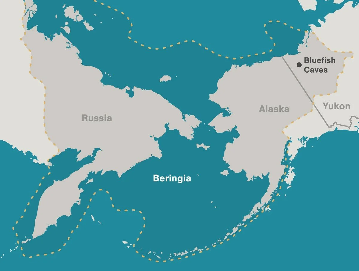 A recent example comes from the field of archaeology. Throughout the 20th century, the predominant hypothesis was that humans first reached the Americas at the end of the last ice age about 13,000 years ago, when melting ice created a now submerged landmass known as Beringia, shown in the figure below. Asian hunters crossed from Siberia to Alaska, these so-called Clovis people (named after a unique type of spear point they used) subsequently migrating south along the edges of melting ice sheets to warmer climes.